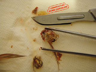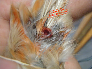 Só removi este quisto com sucesso porque muitos criadores me auxiliaram.. Tenho pena de não ter uma reportagem fotográfica maior, mas como estava sozinho a remover o quisto estava mais preocupado em remover o quisto sem magoar muito a ave e obter a menor perda de sangue possível..